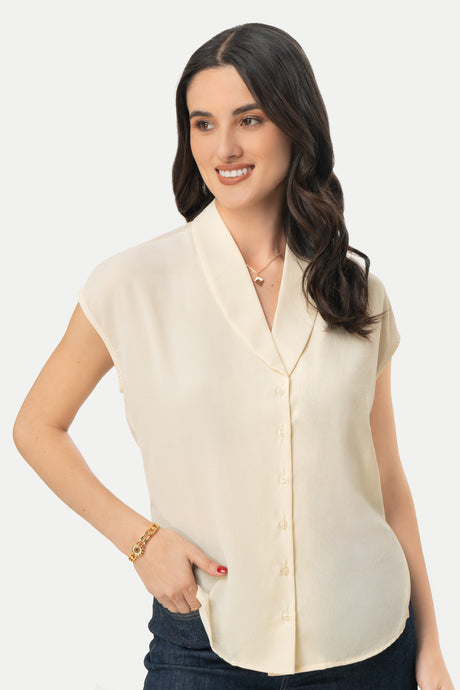 - Escote tipo solapa con caída suave que estiliza el cuello