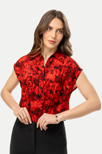 Blusa de gasa estampada con botones funcionales y silueta fluida, ideal para un look fresco y versátil. Perfecta para combinar en outfits casual chic con un aire elegante