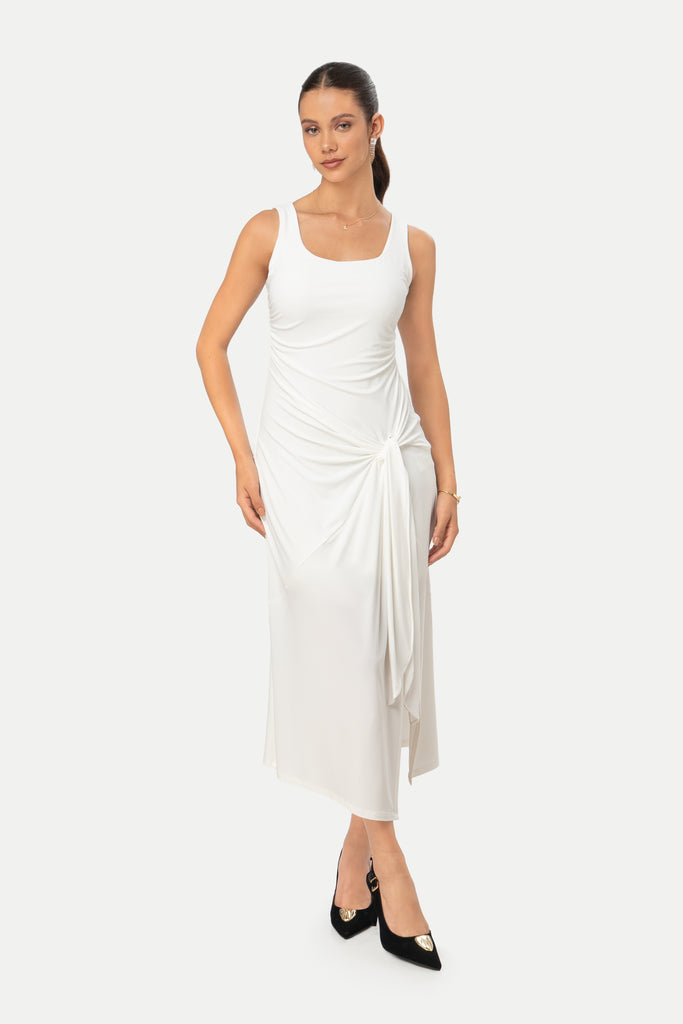 - Aplicacion de frunce lateral que define la cintura y estiliza la silueta