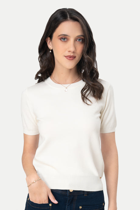 - Cuello redondo que estiliza el escote